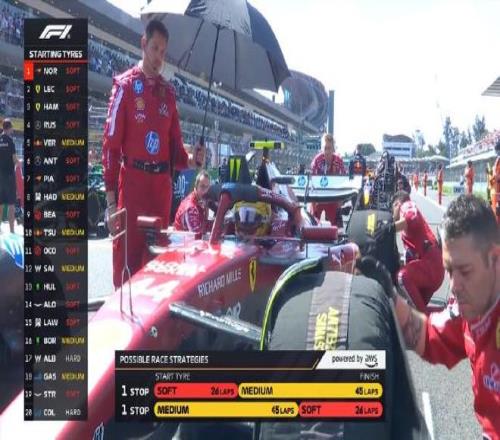 起步轮胎方面:维斯塔潘、哈贾尔、角田裕毅、塞恩斯、博托莱托和加斯利用中性胎起步,阿尔本和科拉平托使用硬胎,其他车手都是软胎。
