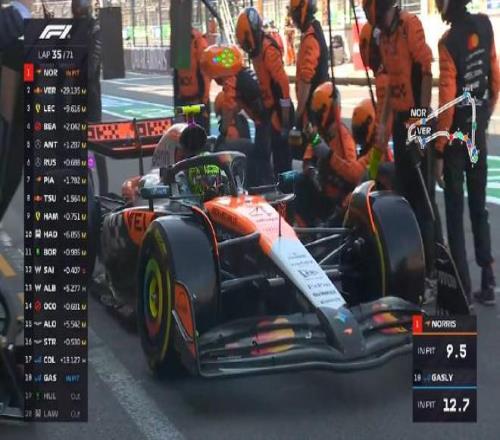 第三十五圈:领跑的诺里斯进站换上中性胎,出站后他仍领先维斯塔潘8秒