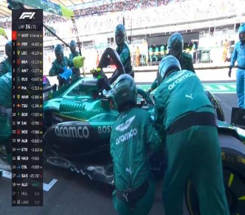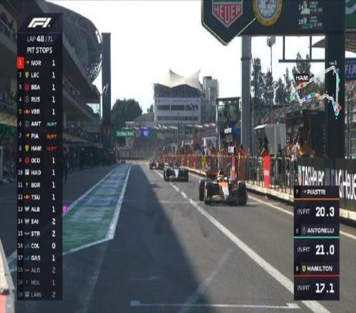 第四十八圈:安东内利、皮亚斯特里和汉密尔顿同时进站,迈凯伦赛车率先出站在维修区完成超越