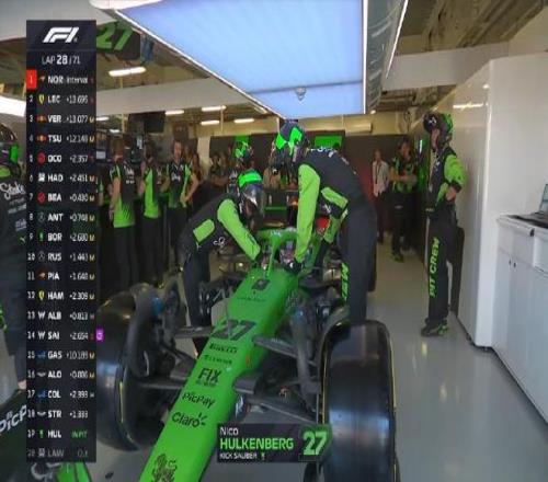 第二十八圈:塞恩斯因在维修区超速被罚时5秒,霍肯伯格赛车出现问题直接选择退赛